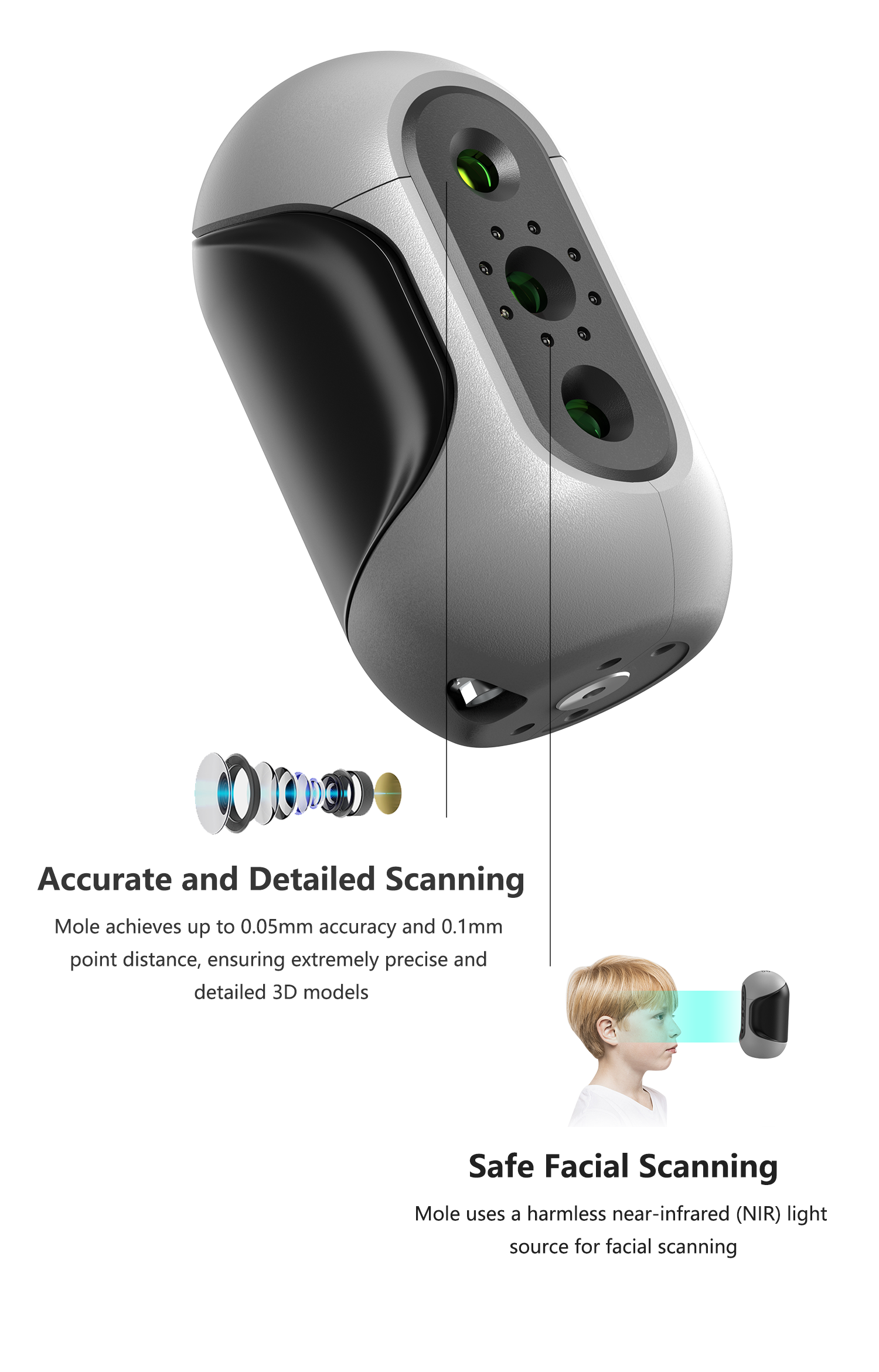 Mole dispose d'objets de numérisation 3D de haute précision avec une précision allant jusqu'à 0,05 mm pour capturer les détails fins. Avec une plage de capture unique de 200 * 100mm et une vitesse de numérisation allant jusqu’à 10FPS, il peut rapidement scanner un objet de taille moyenne. Tout cela peut être produit dans les formats de fichiers 3D les plus largement utilisés OBJ / STL / PLY, prenant en charge une application immédiate ou une créativité supplémentaire.