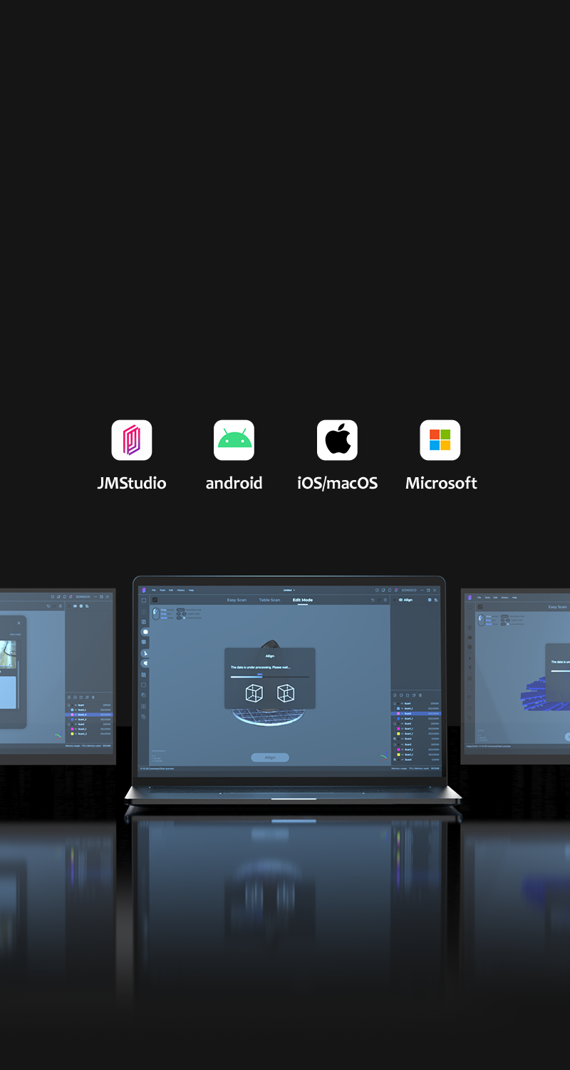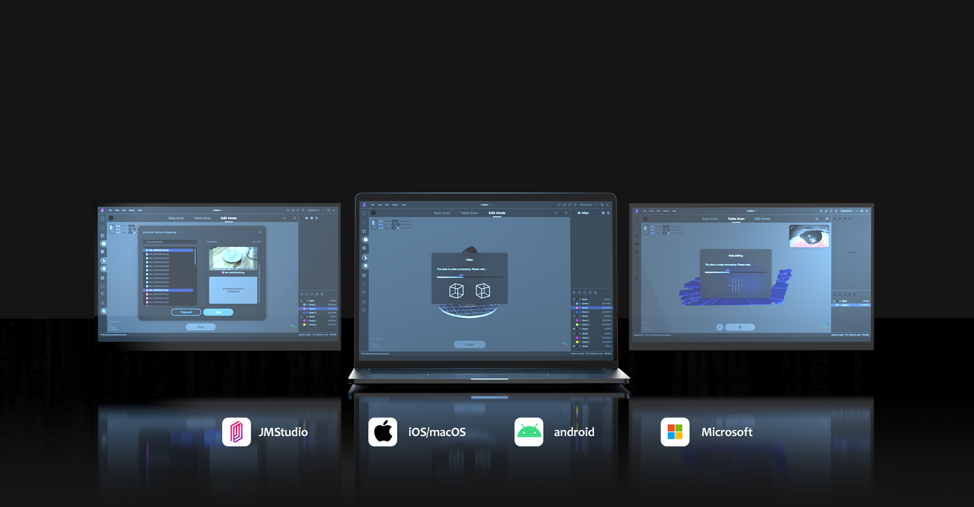 JMStudio supporta l'esportazione di file in formati come OBJ, STL, ASC, consentendo di modificare, perfezionare, renderizzare o stampare le scansioni utilizzando il software di progettazione preferito.