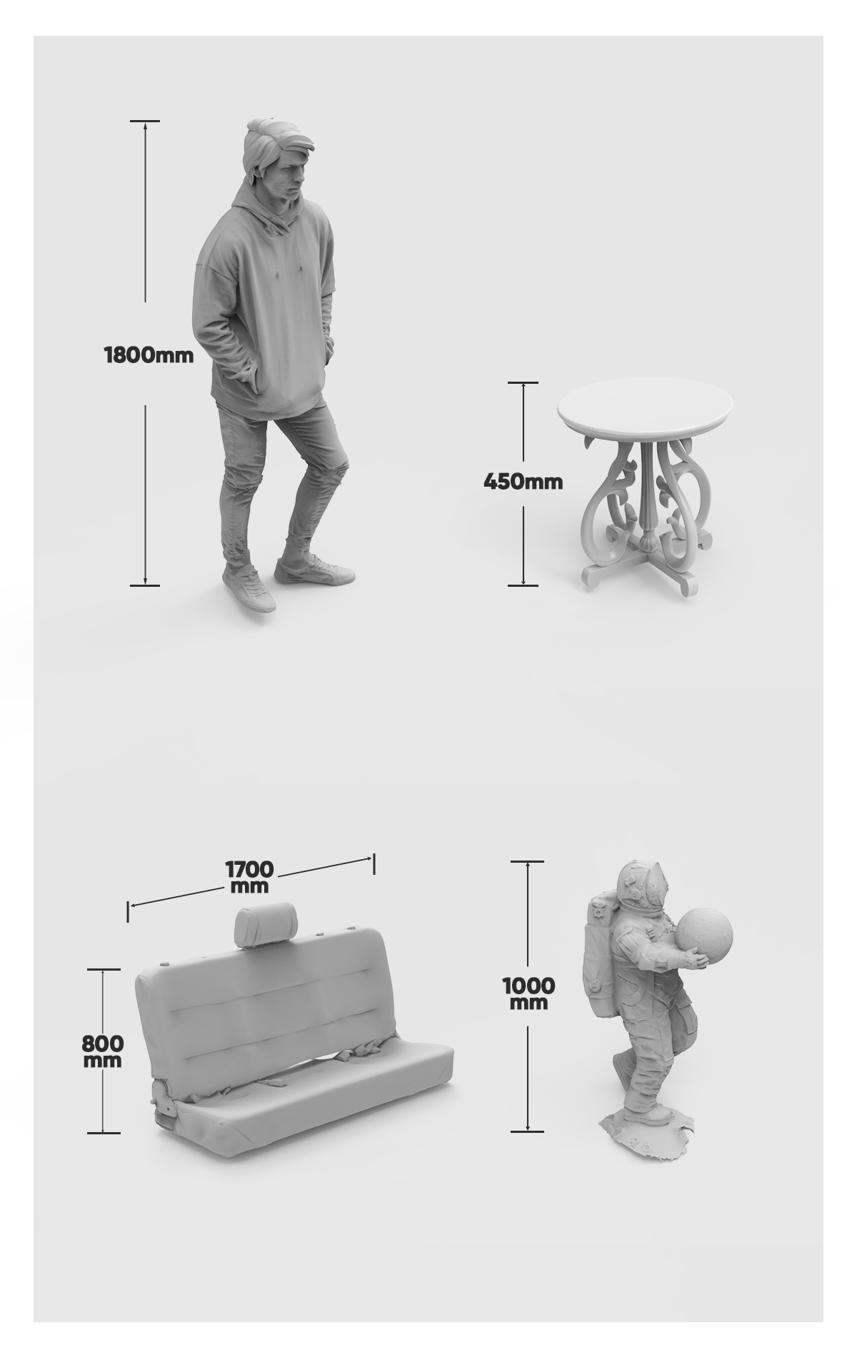 Con Lynx , la scansione di oggetti di medie e grandi dimensioni come corpi umani, mobili, parti di automobili e sculture è un gioco da ragazzi. In pochi minuti, puoi catturare modelli completi e dettagliati che mostrano ogni complessità.